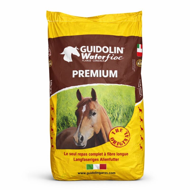 Guidolin krmivo pre kone – Wafer Fioc Premium (balenie 25kg) je kompletné a vyvážené krmivo pre kone s konštantnými nutričnými a energetickými hodnotami, ktoré napomáha gastrointestinálnym funkciám koňa. Všetko, čo váš kôň potrebuje v jednom produkte: seno, lucerna, tepelne vločkované obilniny a strukoviny. Krmivo má veľa vlákniny pre dobré trávenie a obilniny a strukoviny sú dôležitým zdrojom energie . Špeciálna receptúra Wafer Fioc Premium obsahuje aj minerálne soli a vitamíny.